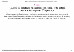 « Mettre les réacteurs nucléaires sous cocon, cette option méconnue à explorer d’urgence » _ Les Echos Laisser un commentaire